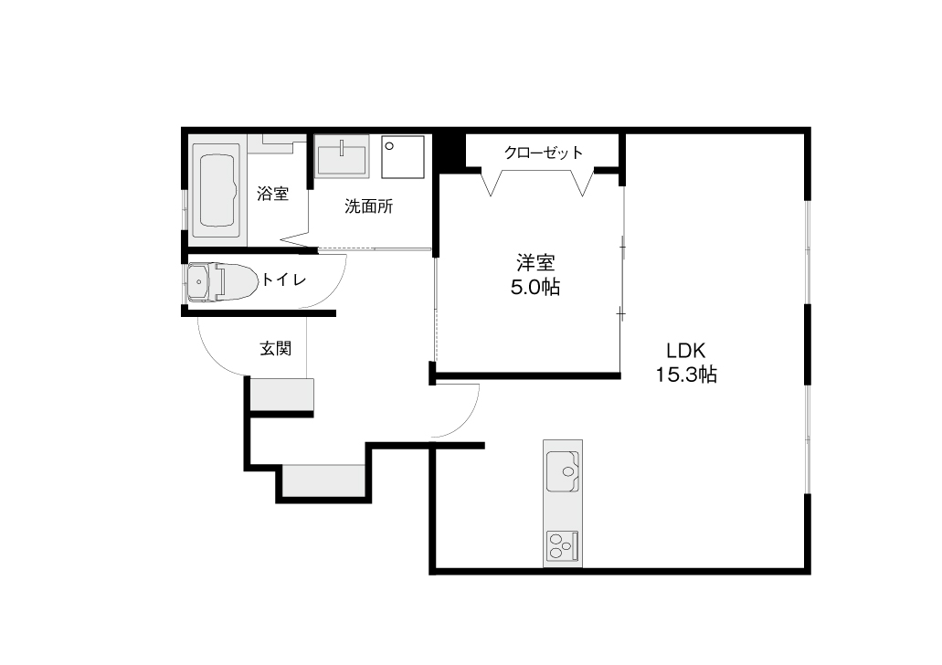 単身の方や新婚さんにおすすめの間取りで、広々としたリビングが開放感を演出しています。