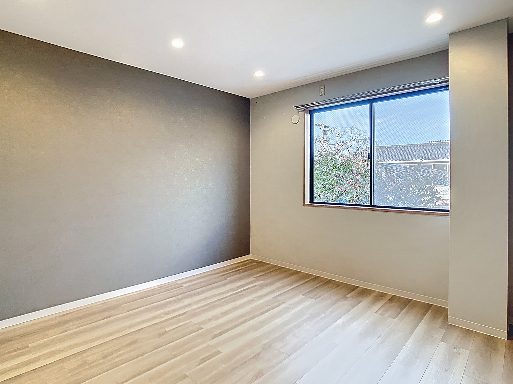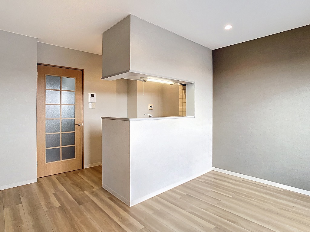 室内はリフォームが施されており、シックで落ち着いたアクセントクロスや、木の温もりを感じるフローリングが採用されています。 特に注目すべきは、対面キッチンです。 お料理をしながらリビングにいるパートナーやご家族と会話を楽しめる設計は、現代のライフスタイルにぴったり。キッチンの収納扉や浴室もリフォーム済みとなっており、水回りの清潔感と使い勝手は抜群です。