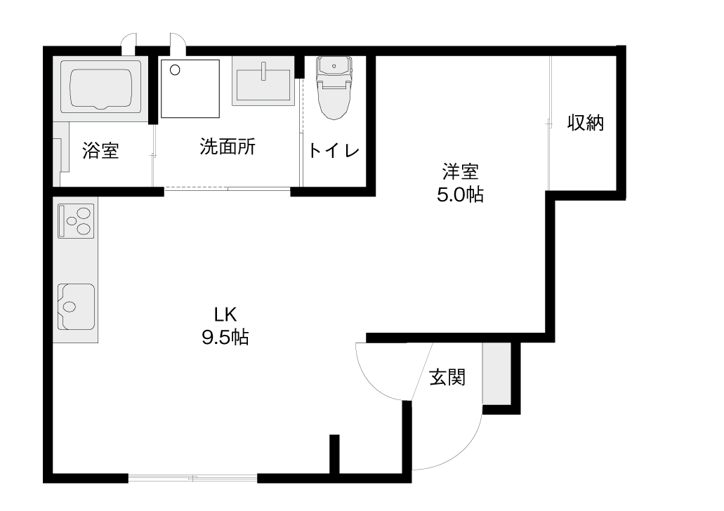 9帖のLDKは長方形に近い形をしており、ダイニングテーブルとソファを分けて配置しやすいレイアウトです。