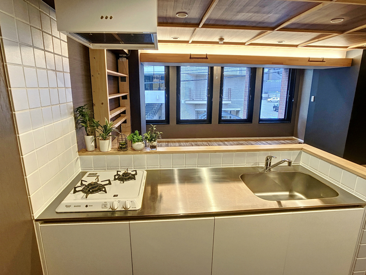 2口コンロを備えたシステムキッチンに加え、開放感のあるカウンターキッチンを採用。作業スペースに余裕があり、効率よく調理ができるのはもちろん、リビングを見渡せる設計により、空間の一体感も魅力です。コーヒーメーカーや調理器具を並べ、自分好みのキッチン空間をつくることで、日々の料理が“作業”から“楽しみ”へと変わります。